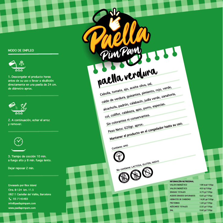 Zanahoria, col, coliflor, cebolla, calabacín, tomate, pimiento rojo, pimiento verde, judía verde, alcachofa, espárrago, arroz y caldo.